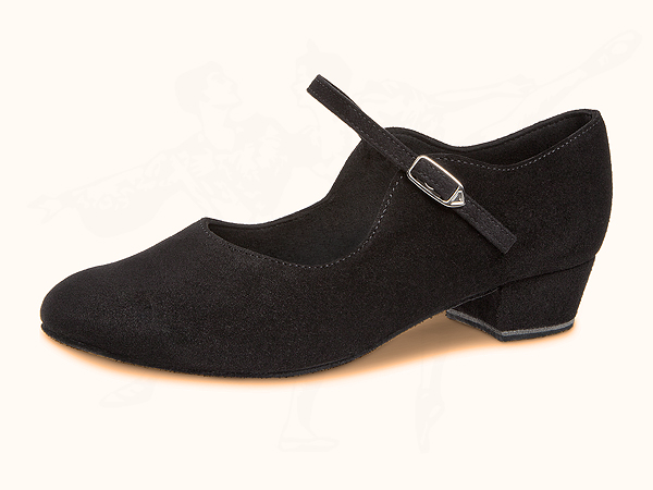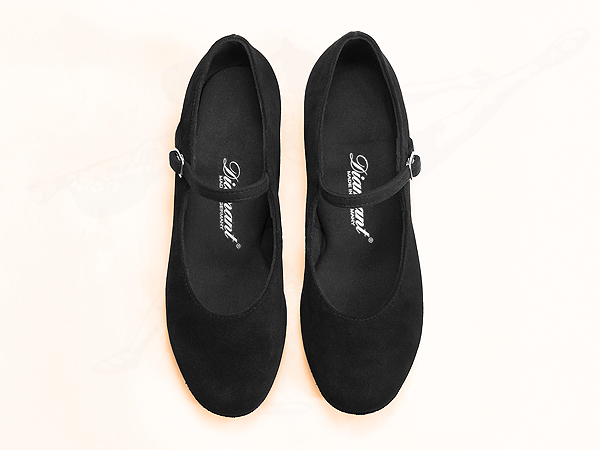 Handgefertigte Damen-Tanzschuhe mit Comfort-Fußbett und Ristriemchen mit Druckknopfschnalle. Diese Tanzschuhe sind in Normalweite F und runder Vorderkappe gefertigt und zeichnen sich durch eine sehr bequeme Passform aus. Der niedrige 2,8 cm Blockabsatz mit großer Auftrittsfläche garantiert für hervorragende Stabilität. Der Oberteil ist aus weichem, italienischen Velourleder gefertigt das sich sofort an den Fuß anpasst und so Druckstellen verhindert. Für das Innenmaterial ist atmungsaktive und Feuchtigkeit absorbierende Micorfaser verarbeitet. Die hochwertige Rauledersohle sorgt für optimalen Halt bei Ballenschritten.