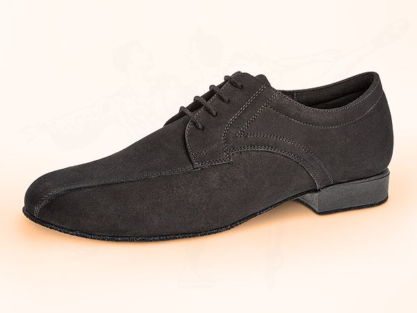 Sportliche Herren-Tanzschuhe mit Derby-Schnitt und offener 4-Loch Schnürung. Der gepolsterte Schaftrand verhindert Druckstellen. Dieser Tanzschuh wird in der Weite H (bequem) mit einem Schock absorbierenden 2 cm Standard Absatz hergestellt. Als Futtermaterial ist eine atmungsaktive und Feuchtigkeit absorbierende Microfaser verarbeitet. Der Oberteil besteht aus weichem italienischen Nubukleder.